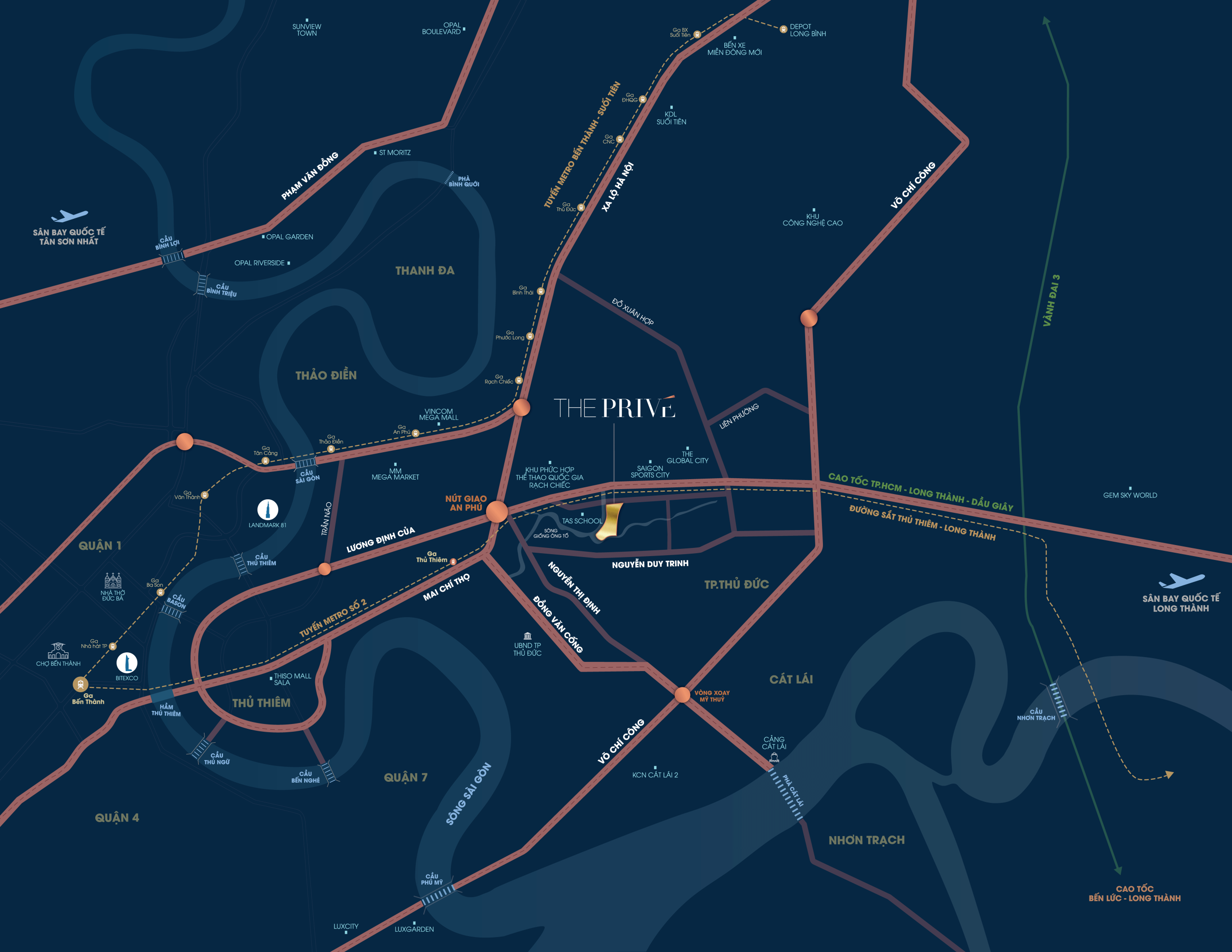 The Privé nằm tại Khu Nam Rạch Chiếc – phường An Phú, Quận 2 (TP. Thủ Đức), ngay mặt tiền đường Song Hành cao tốc TP.HCM – Long Thành – Dầu Giây. Đây là một trong những khu đất hiếm hoi sở hữu 3 mặt giáp sông, bao bọc bởi sông Giồng Ông Tố và các nhánh rạch tự nhiên.